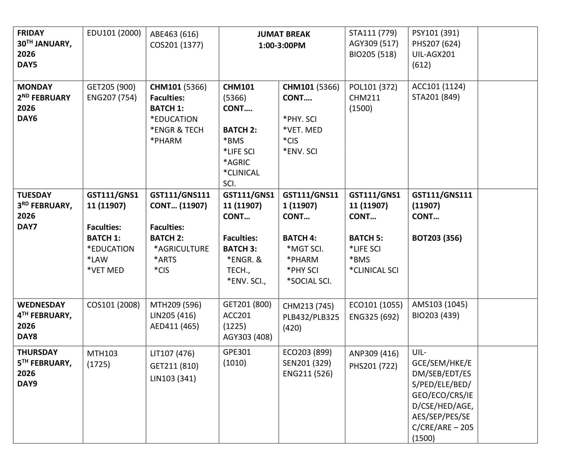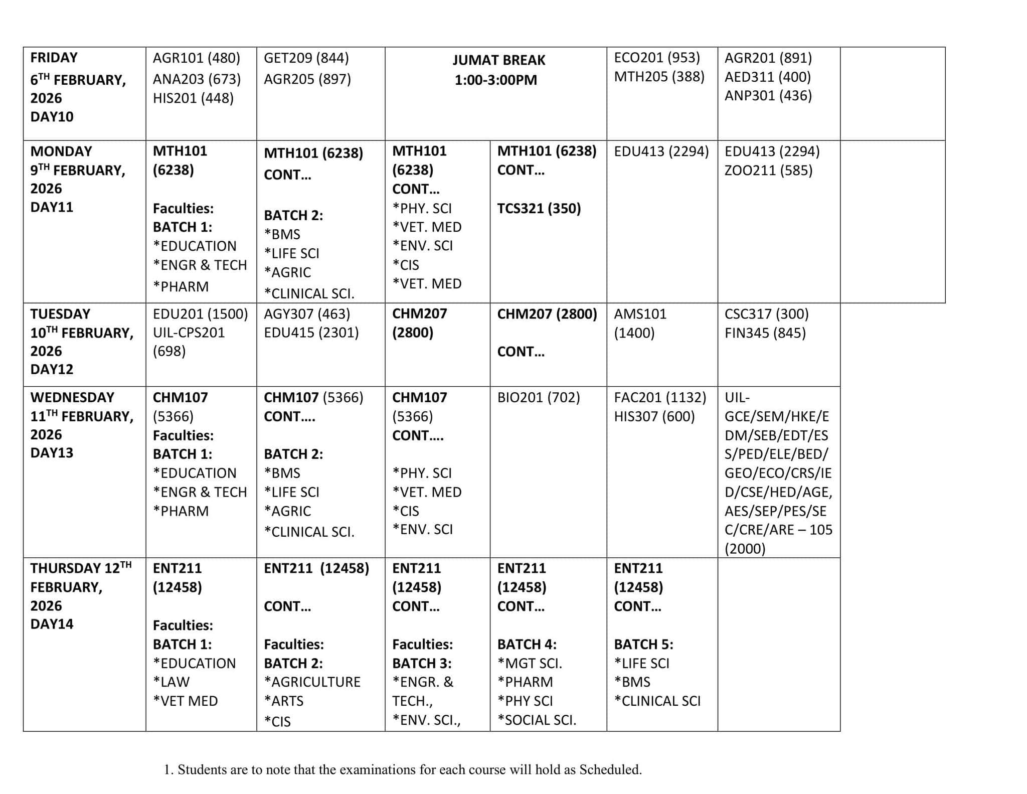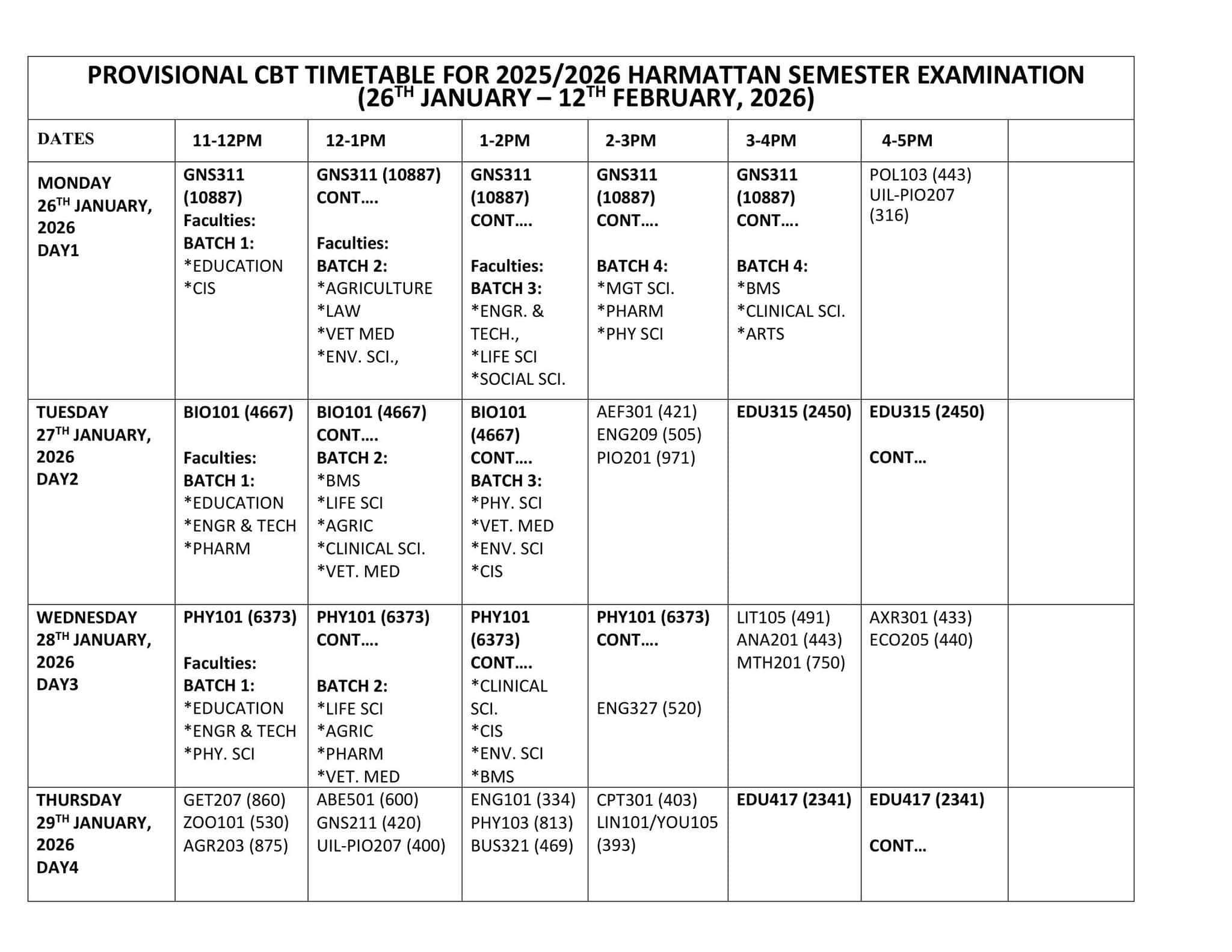 The exams are scheduled to run from Monday, January 26 to Thursday, February 12, 2026. During this period, students will sit for their papers in batches each day, based on faculty, department, and registered courses. Each course has its own time slot, and students are expected to stick to the time listed for them.